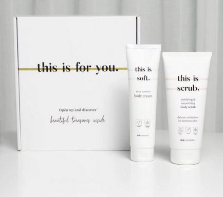 Deze set bevat 1x body scrub 'This is Scrub.' (200ml) en 1x body cream 'This is Soft.' (150ml).